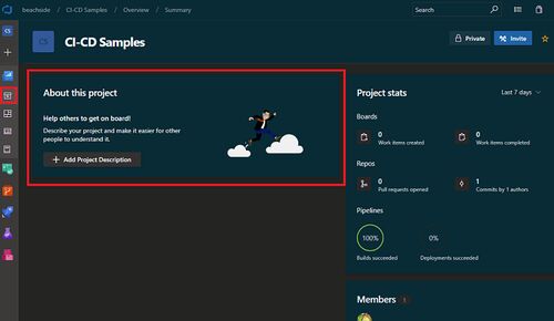 Azure DevOps の Overview の Summary に「About this project」という部分があります。「About this project」では Description を書くことができるほか、以下のどちらかを表示することができます。 指定したリポジトリーの直下にある Readme.md Wiki のト…