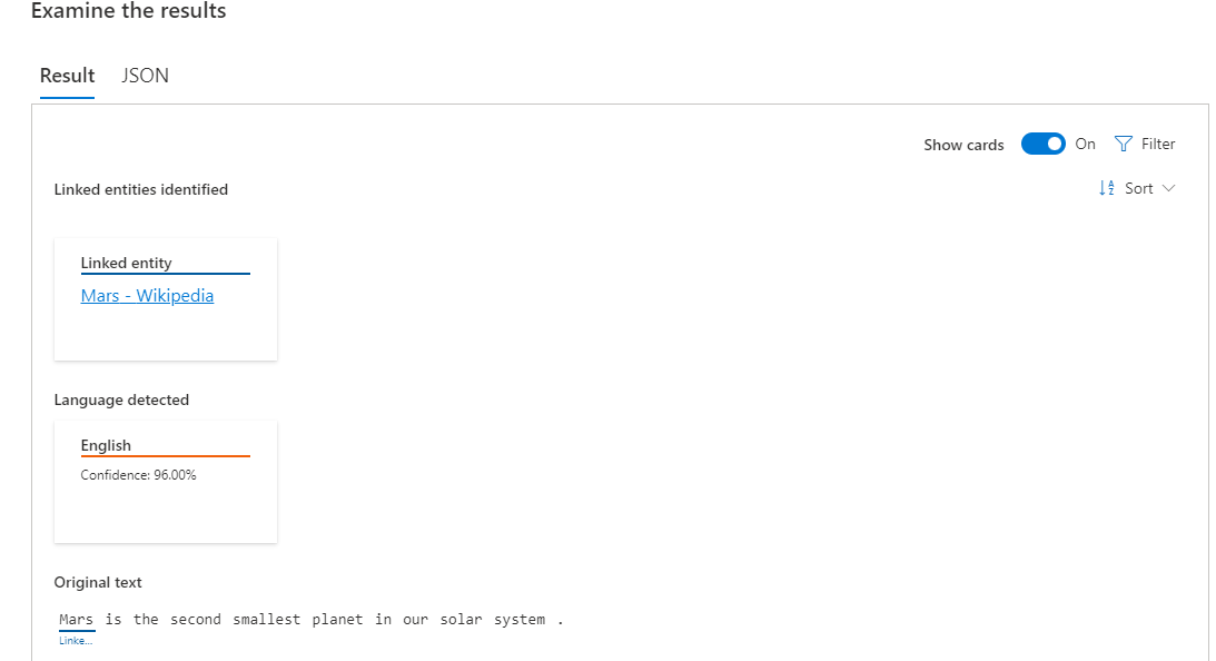 Language Studio で、"Mars" という単語について試してみましょう。"Mars" には火星という意味があるのでこんな文章を入力してみます。