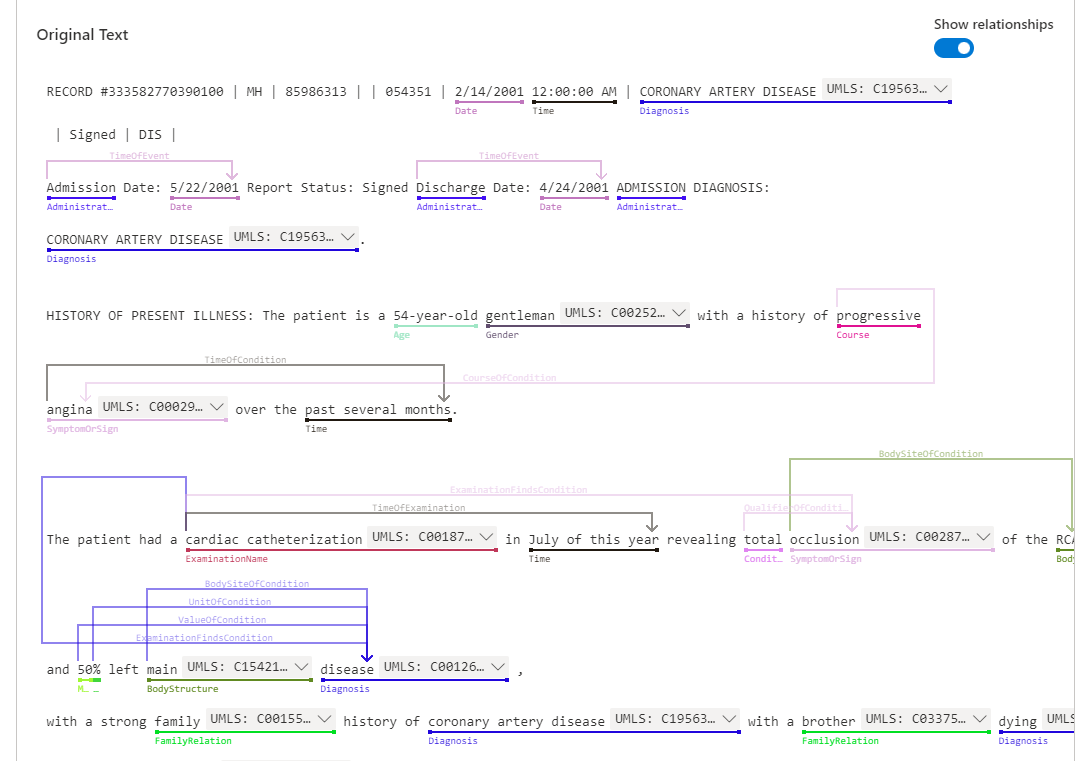 医師のメモ、退院要約、臨床ドキュメント、電子健康記録などの非構造化テキストから関連する医療情報が抽出されてラベルが付けられます。Microsoft Research のチームがお客さん向けにカスタマイズしたサービスのようなので、英語圏での実用レベルも高いのかもしれませんね。