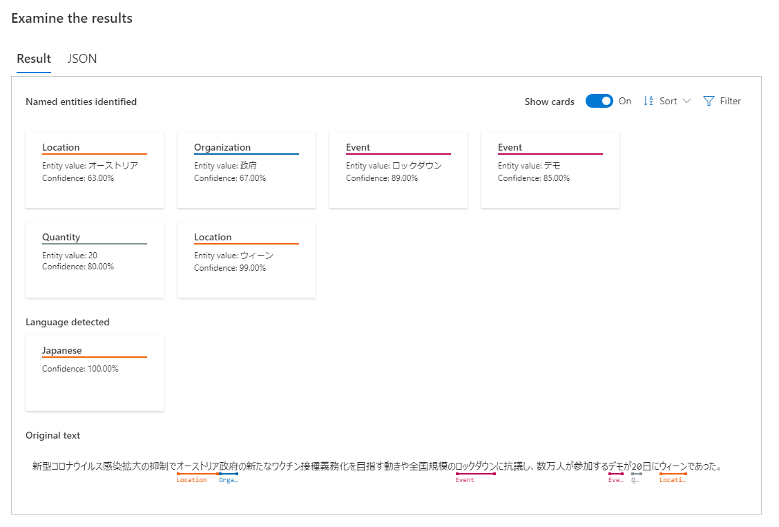 Language Studio での結果はこうなります。場所、組織やイベントがラベリングされてきます。想像した感じですが、日付がうまく取れないなーくらいが気になり色々試したけど、ほとんラベリングされなかった。