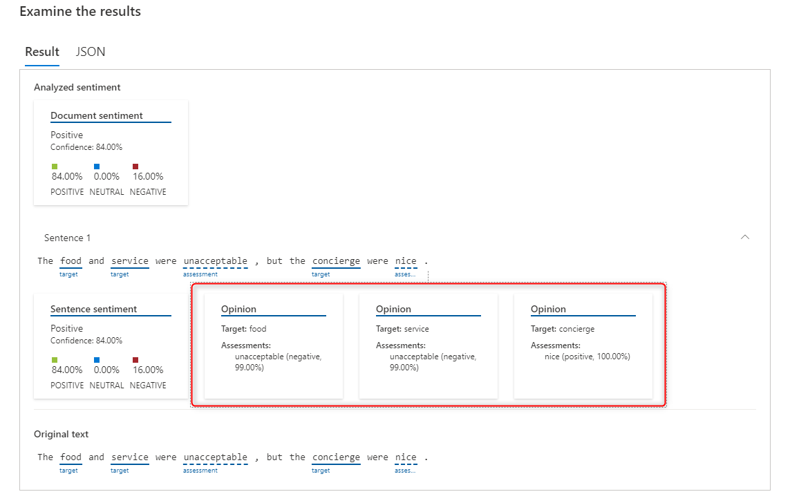 結果はこんな感じで、"food" と "service" には negative: 99%、"concierge" に対して positive: 100% と分析できています。