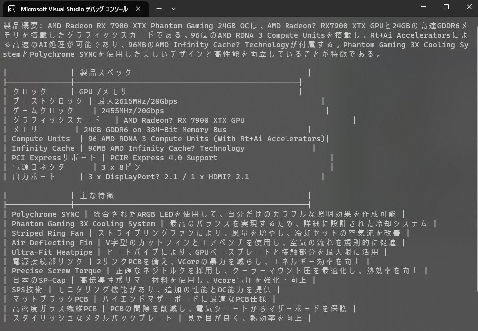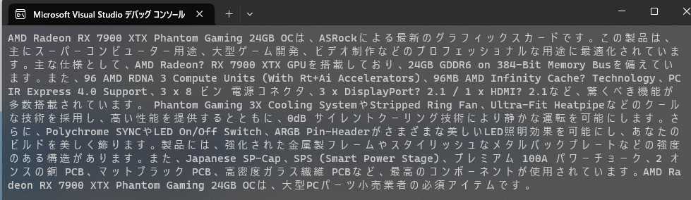 // こちらから引用させて頂きました♪ // https://pg.asrock.com/Graphics-Card/AMD/Radeon%20RX%207900%20XTX%20Phantom%20Gaming%2024GB%20OC/index.jp.asp var factSheet = """ ## PRODUCT NAME: AMD Radeon RX 7900 XTX Phantom Gaming 24GB OC ## PRODUCT BRIEF - クロック:GPU /メモリ - ブーストクロック: 最大 2615MHz / 20Gbps - ゲームクロック: 2455MHz / 20Gbps - 主な仕様 - AMD Radeon™ RX 7900 XTX GPU - 24GB GDDR6 on 384-Bit Memory Bus - 96 AMD RDNA 3 Compute Units (With Rt+Ai Accelerators) - 96MB AMD Infinity Cache™ Technology - PCI® Express 4.0 Support - 3 x 8 ピン 電源コネクタ - 3 x DisplayPort™ 2.1 / 1 x HDMI™ 2.1 - 主な特徴 - Polychrome SYNC - Phantom Gaming 3X Cooling System - Striped Ring Fan - Reinforced Metal Frame - スタイリッシュなメタルバックプレート - 0dB サイレントクーリング - Super Alloy Graphics Card ## PRODUCT FEATURES - Reverse Spin - The center fan spins reversely to lower turbulence and enhance air dispersion through the heatsink. - Phantom Gaming 3X Cooling System For Cool And Silent. - Crafted for the best balance between the thermal efficiency and silence by all the details. - Striped Ring Fan Designed For Enhanced Airflow - ASRock’s all new Striped Ring Fan get more lateral intake and to provide better airflow through the cooling array. - Air Deflecting Fin Guide Airflow To Go Through Regularly & Quickly. - Guide the airflow to go more regularly and quickly to enhance the cooling efficiency by the V-shaped cutting fins and the V-shaped air vents. - Ultra-Fit Heatpipe Consolidated To Maximize The Contact. - The heatpipes are consolidated to maximize the contact among each others and also the GPU baseplate for the optimized heat dissipation. - Nickel-Plated Copper Base Maximize GPU Contact Area. - With premium copper base heatsink design, the direct contact area to the GPU would be maximized to improve thermal transfer effectively. - High-Density Metal Welding Improve Heat Dissipation. - Effectively isolate all coverage of the gap between pipe and stacked fins, hence improve heat dissipation effectively. - Nano Thermal Paste Perfect Thermal Teamwork. - Eliminate the gaps in the contact area to maximize heat transfer and thermal efficiency. - Premium Thermal Pad Better Heat Transfer. - The premium thermal pad helps to transfer the heat of the components to the heatsink, improving heat dissipation. - Precise Screw Torque Optimized Mounting Pressure. - ASRock adopts precise screw torque when assembling its graphics cards to optimize the cooler mounting pressure to improve thermal efficiency while avoiding damage to GPU die. - 0dB サイレントクーリング - 作業負荷が軽いときには、0dB サイレントクーリング技術がノイズなしにファンを完全に停止します。 - Polychrome SYNC - 統合された ARGB LED を使用して、独自のカラフルな照明効果を作成してください。また、Polychrome SYNC に対応する ASRock マザーボードと同期させることもできます。 - LED On/Off Switch On Or Off? Switch As You Want. - You can switch not only the built-in ARGB LEDs but also the ARGB LEDs equipping with the connected strips/devices at once. - ARGB Pin-Header More ARGB, More Fancy. - With the ARGB pin-header, it can connect ARGB strips/devices to make the lighting effects more rich and vivid. - 強化された金属製フレーム - 強化された構造で PCB が曲がることを防止します。 - スタイリッシュなメタルバックプレート - Phantom Gaming ルックです。Phantom Gaming グラフィックスカードのスタイリッシュなメタルプレートは、おしゃれな外観で頑丈な構造です。さらに、裏側のサーマルパッドも熱効率を向上させます。 - Japanese SP-Cap - With a high conductive polymer as the electrolyte, it has a lower equivalent series resistance (ESR) to provide outstanding electrical characteristics. In addition to that, it also has excellence in product operational life, reliability and heat resistance. - SPS (Smart Power Stage) - Dr.MOS design features the latest SPS (Smart Power Stage) technology. It’s optimized for monitoring current and temperature of each phase, thus delivering smoother and neater power to the GPU with enhanced performance and OC capability. - プレミアム 100A パワーチョーク - 従来のチョークと比較して、ASRock の新世代プレミアムパワーチョークは飽和電流を最大 3 倍まで効果的に増加させるため、マザーボードの Vcore 電圧が強化・向上します。 - 2 オンスの銅 PCB - PCB レイヤー向けに厳選された銅材料を使用しています。2 オンスの銅 PCB は、オーバークロックの際に温度を低く抑えて、優れたエネルギー効率を提供します。 - マットブラック PCB - 新しい神秘的なマットブラックと銅のカラースキームは ASRock のハイエンドマザーボードの最高のコンポーネントにぴったりです。 - 高密度ガラス繊維 PCB - 高密度ガラス繊維 PCB 設計は、PCB レイヤー間の隙間を減らして、湿度による電気短絡からマザーボードを保護します。 """; var prompt = $""" あなたのタスクは、製品の Fact sheet に基づいて、製品の販売 Web サイトでの説明文を作成することです。 説明文は、日本語で作成する必要があります。 以下の3つのバッククォートで区切られた Fact sheet の情報に基づいて、製品の概要を記述してください。 Fact sheet: ```{factSheet}``` """;