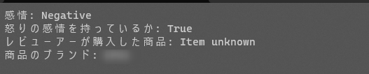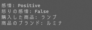 var reviewText = """ 寝室におしゃれなランプが欲しかったのですが、これは追加の収納スペースもついているのに価格もそれほど高くありませんでした。 発送中にランプのケーブルが切れてしまったようですが、会社はすぐに新しいものを送ってくれました。 こちらも数日以内に届きました。組み立ても簡単でした。 足りない部品があったのでサポートに連絡したところ、こちらもすぐに発送してくれました。 ルミナは顧客と製品を大切にする素晴らしい会社と感じました。 """; var prompt = $""" Review Text は 3 つのバッククォートで区切られています。 あなたタスクは、Review Text から次のことを特定します。 - 感情 ("Positive" または "Negative" のどちらかで回答) - レビューアーは、怒りの感情を持っているか ( "true" または "False" で回答) - レビューアーが購入した商品。情報が存在しない場合は "Item unknown" と回答。 - 商品のブランド。情報が存在しない場合は "Brand unknown" と回答。 回答はできるだけ短くしてください。 Review Text: ``` {reviewText} ``` """;