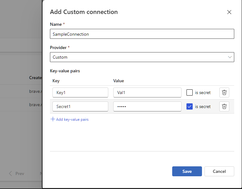 CustomConnectionの引数を追加します。 - 6, 7 行目で書いた感じでキーを指定して値の取得が可能です。