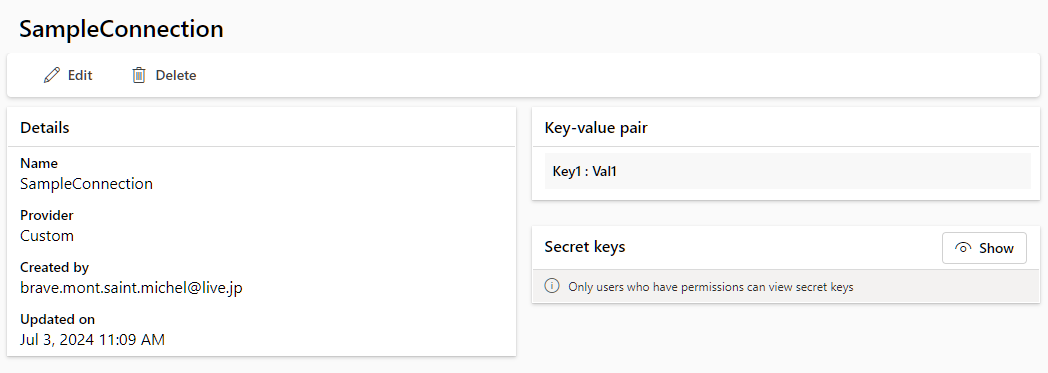 作成した Connection をみるとこんな感じ。シークレットとして登録した値は、"Show" ボタンをクリックしてみることはできるので、そこまで制約として強くないですが、Permission で見えないように制御はできるみたい。
