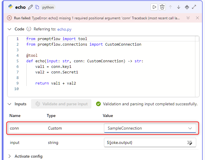 あとは、どの custom connection を利用するかですが、この Python tool の inputs から指定します。ただ、私の環境ではいつも以下図のようにコードで追加した conn が表示されないです。その場合は、一度実行してエラーにするとよいです (実行が遅いからだるいですが...)。